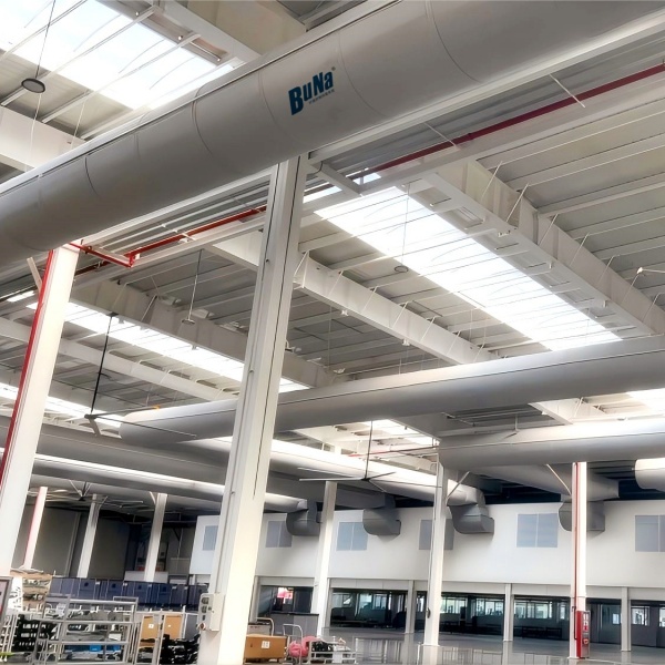 内支撑型布袋风管是一种由特殊纤维织成的柔性空气分布系统,通过内置骨架增强结构稳定性,兼具传统风管功能与柔性材料优势,广泛应用于机场、厂房、体育馆等大空间场所。